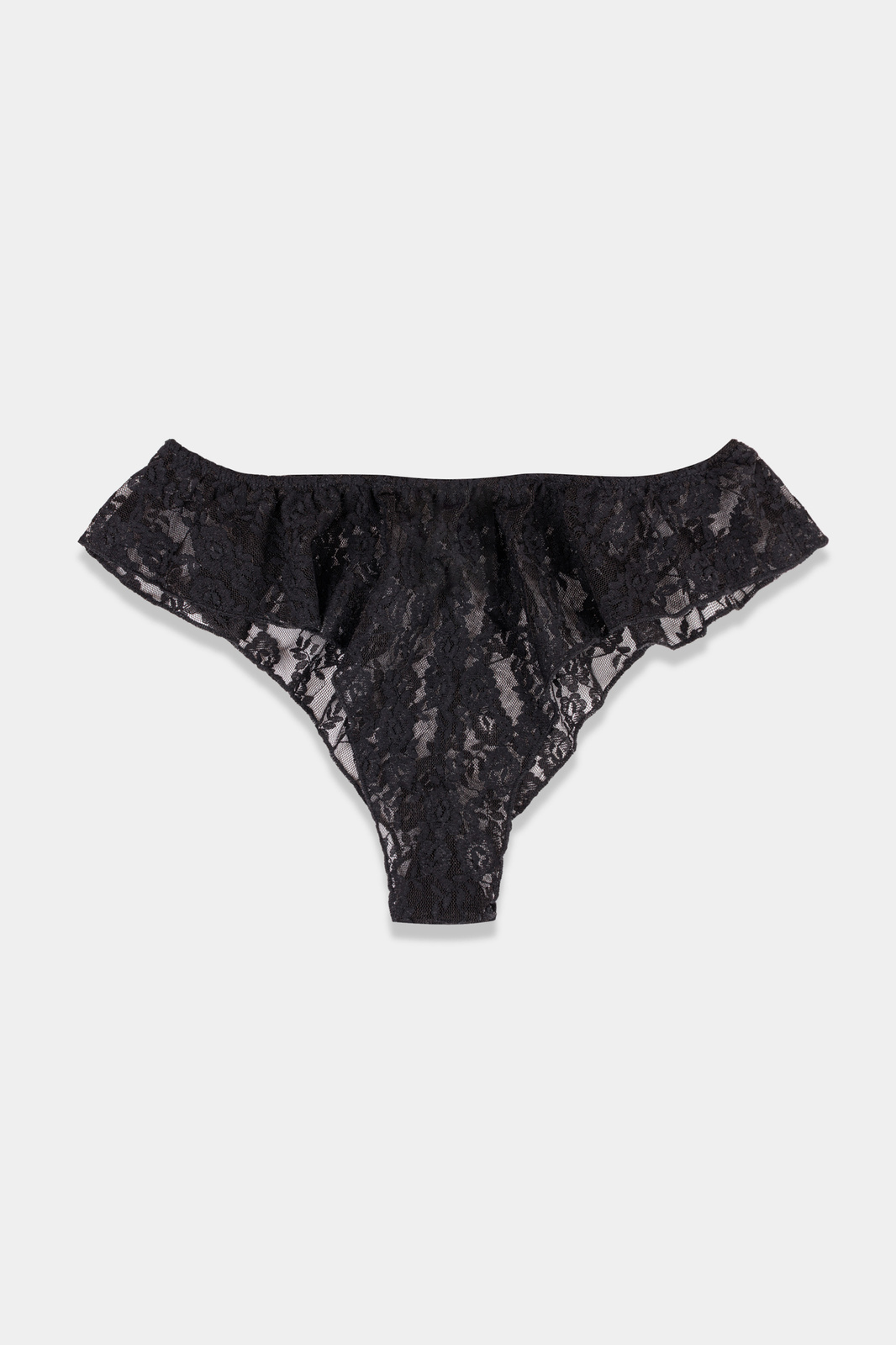 Cheeky flutter panty with elastic waistband made of seethrough, stretchy lace in black.