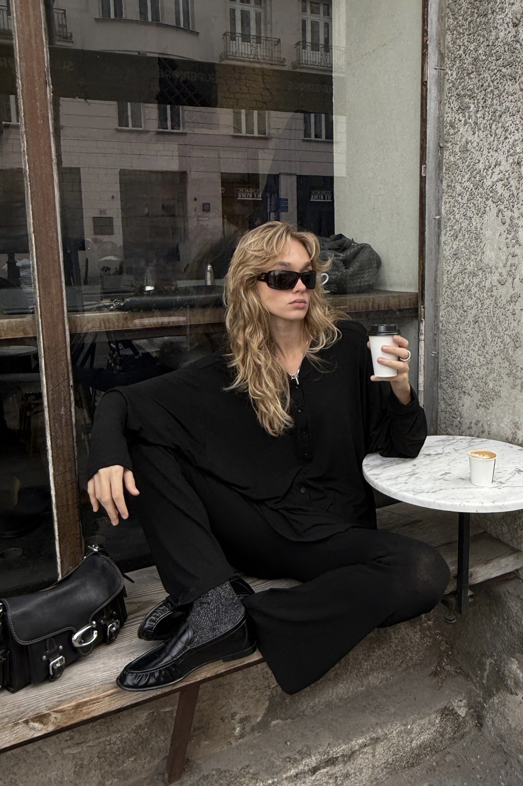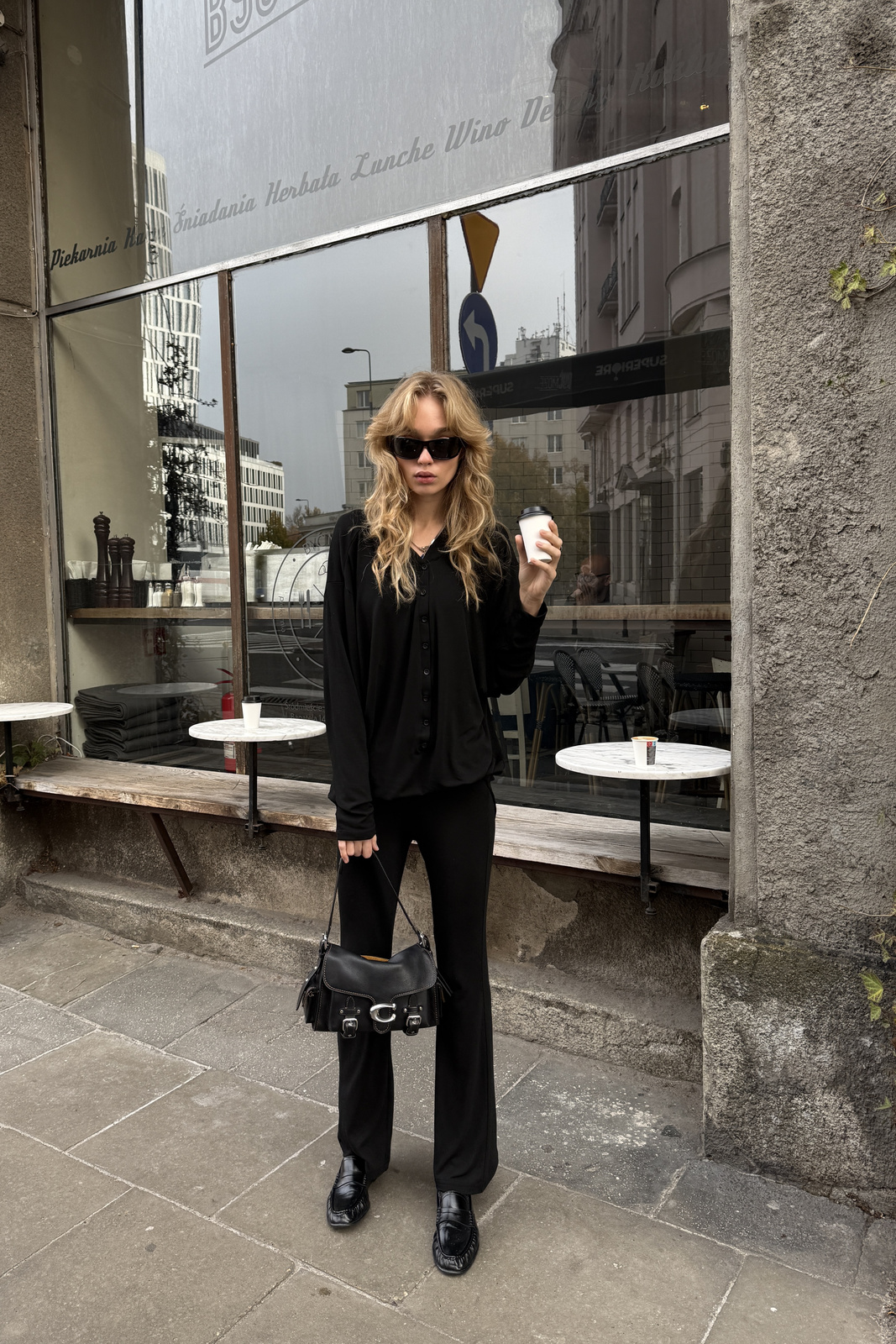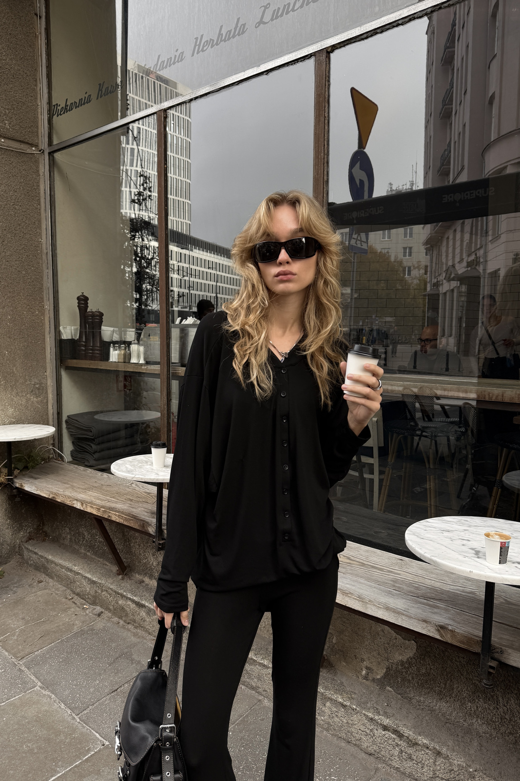 Oversized, half button longsleeve made of viscose and elastane blended jersey knit in black.