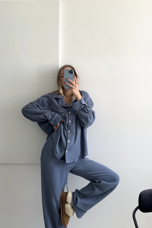 Hight rise, straight leg trousers made of 100% cotton blue denim muslin.