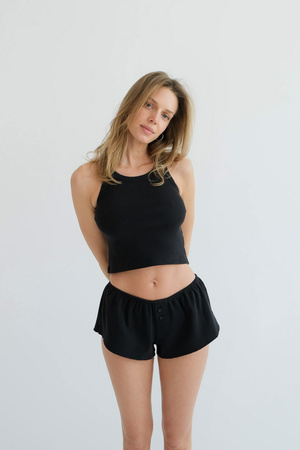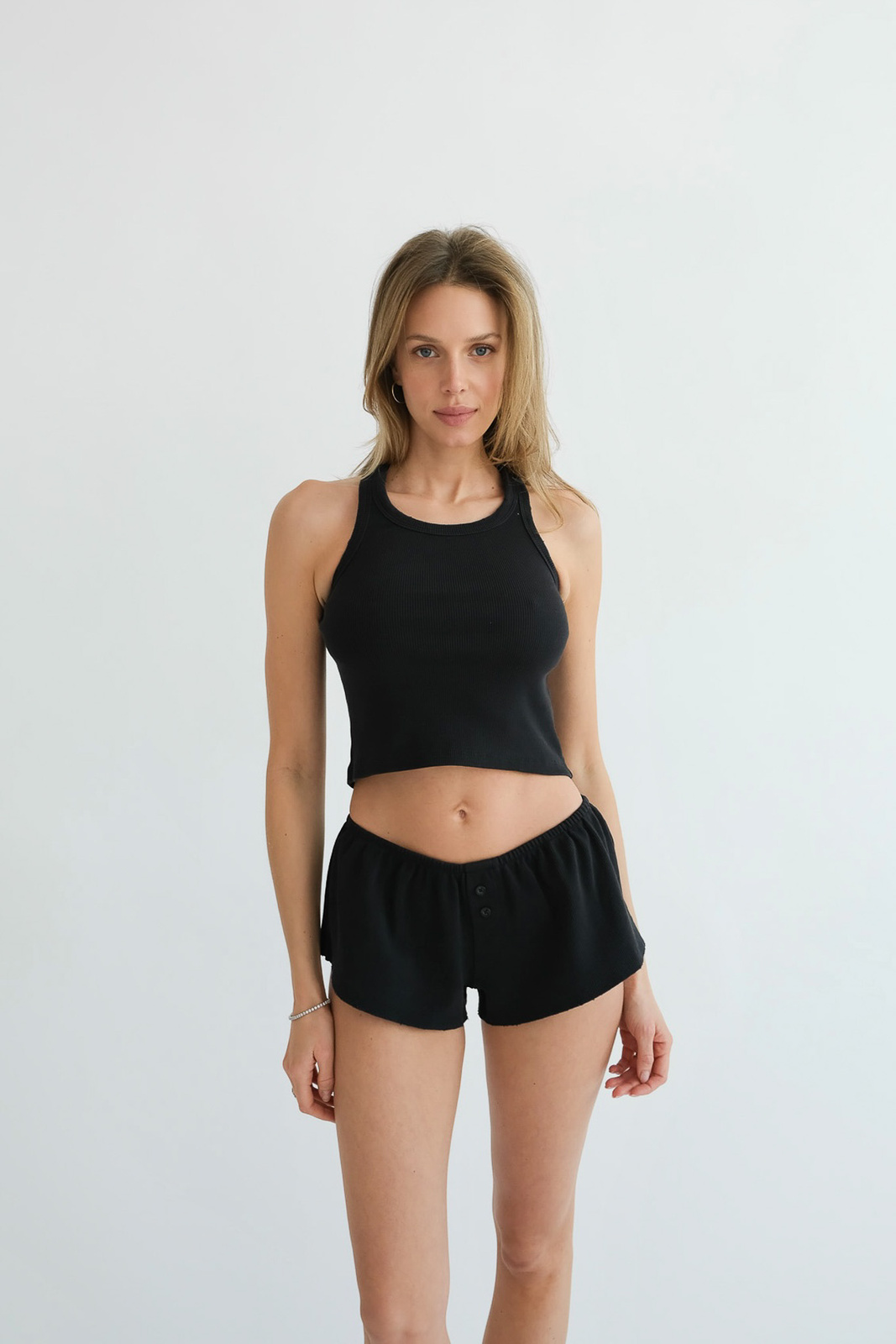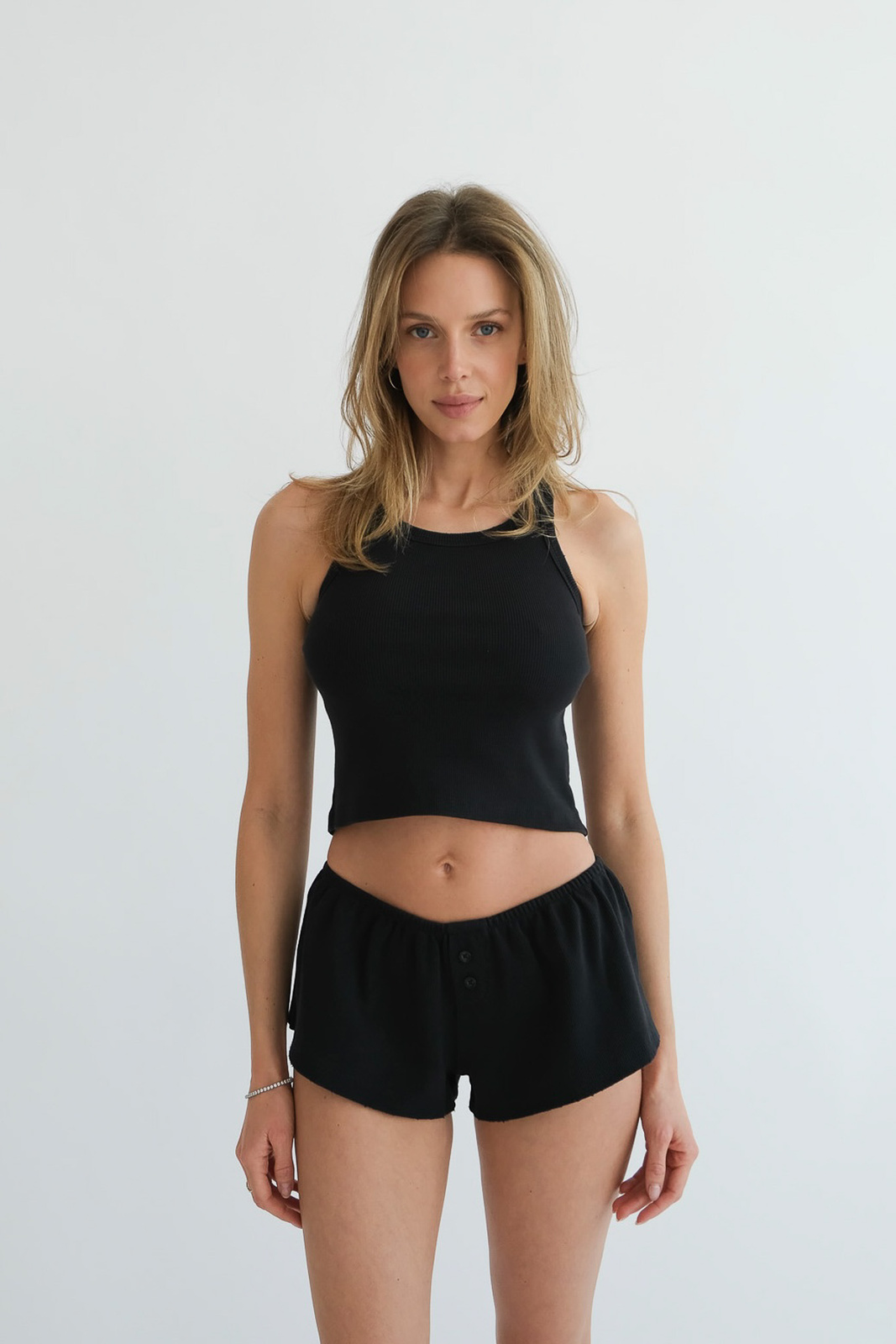 Regular fit, cropped tank top made of high quality, ribbed cotton blend in black. Hems have been pre-distressed to give a bolder, slightly edgy look.