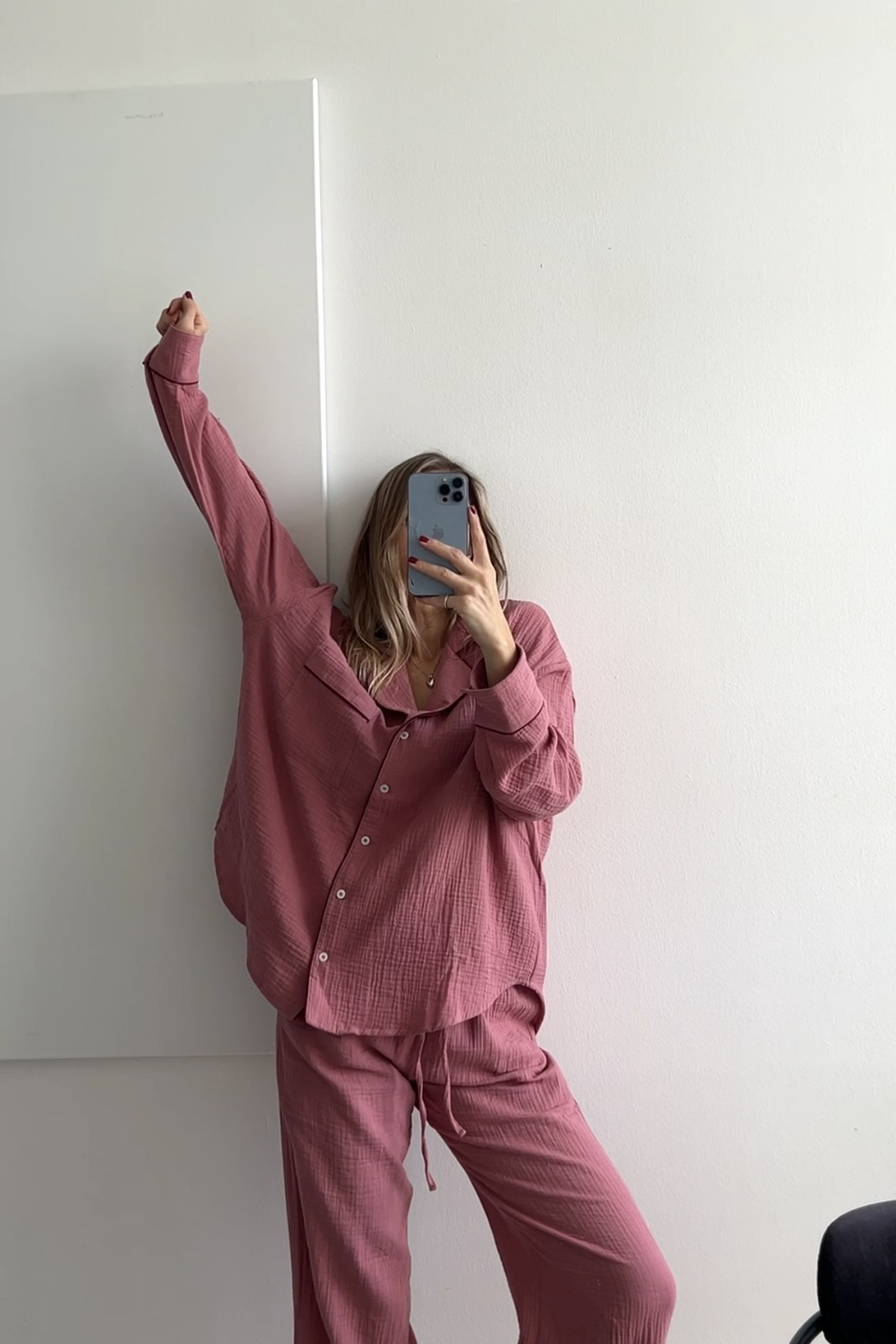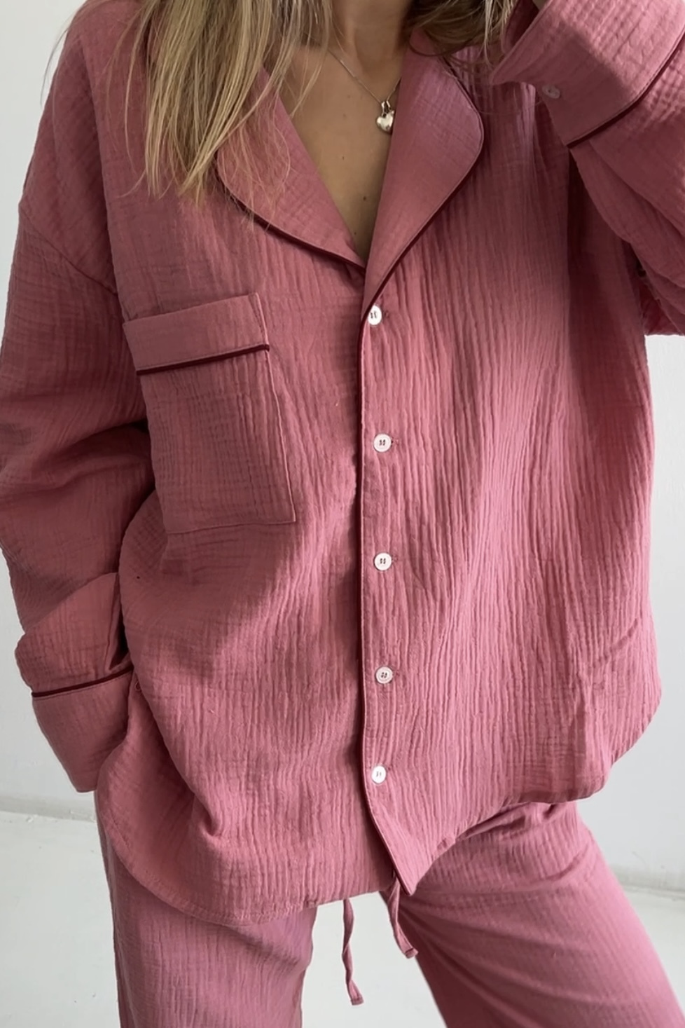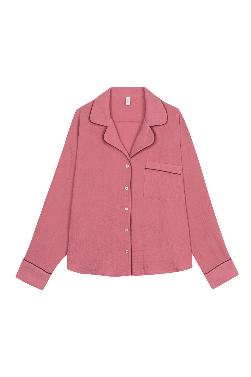Loose fit, button-up shirt made of 100% cotton dusty pink muslin.