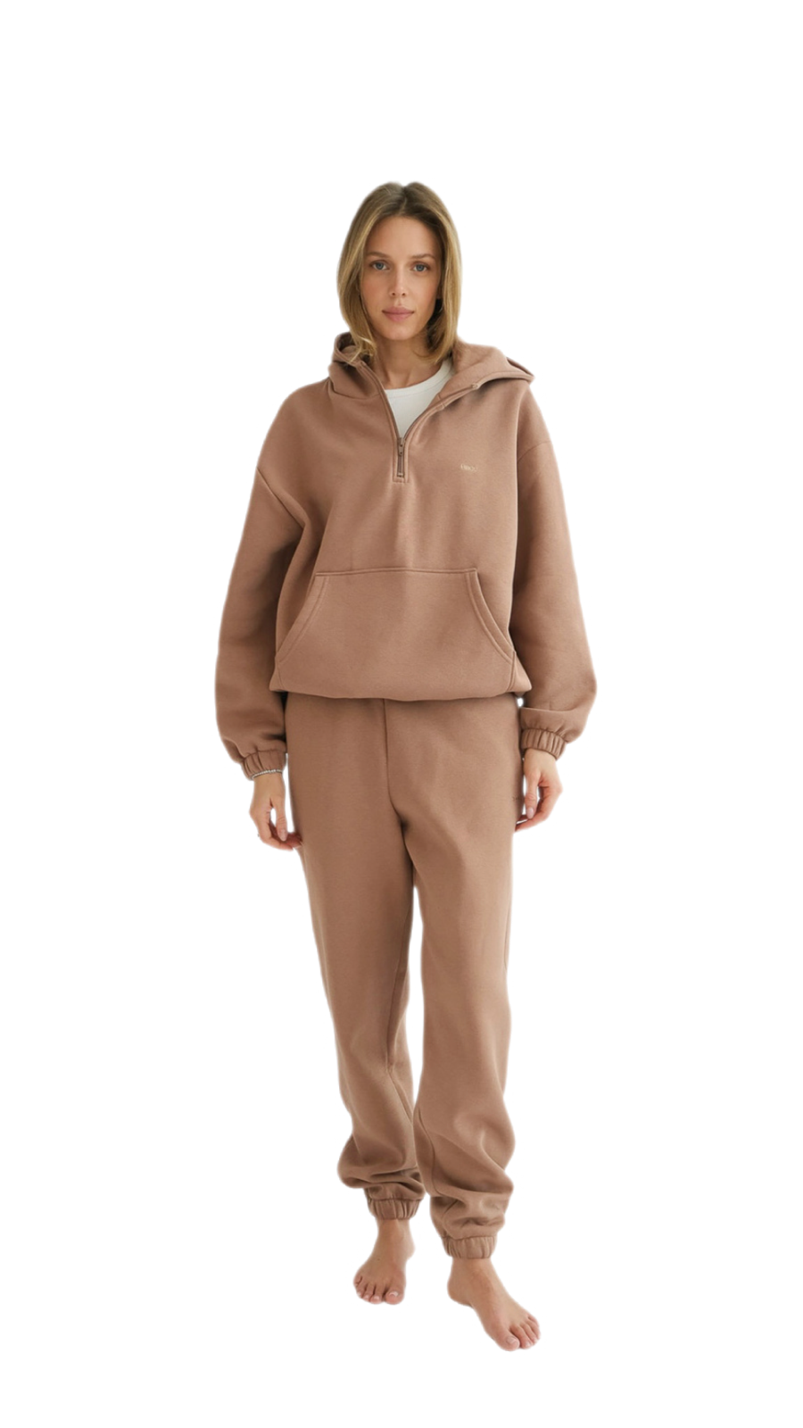 Oversized, half zip, unisex hoodie, lined with fleece, made of cotton blend in mocha color.