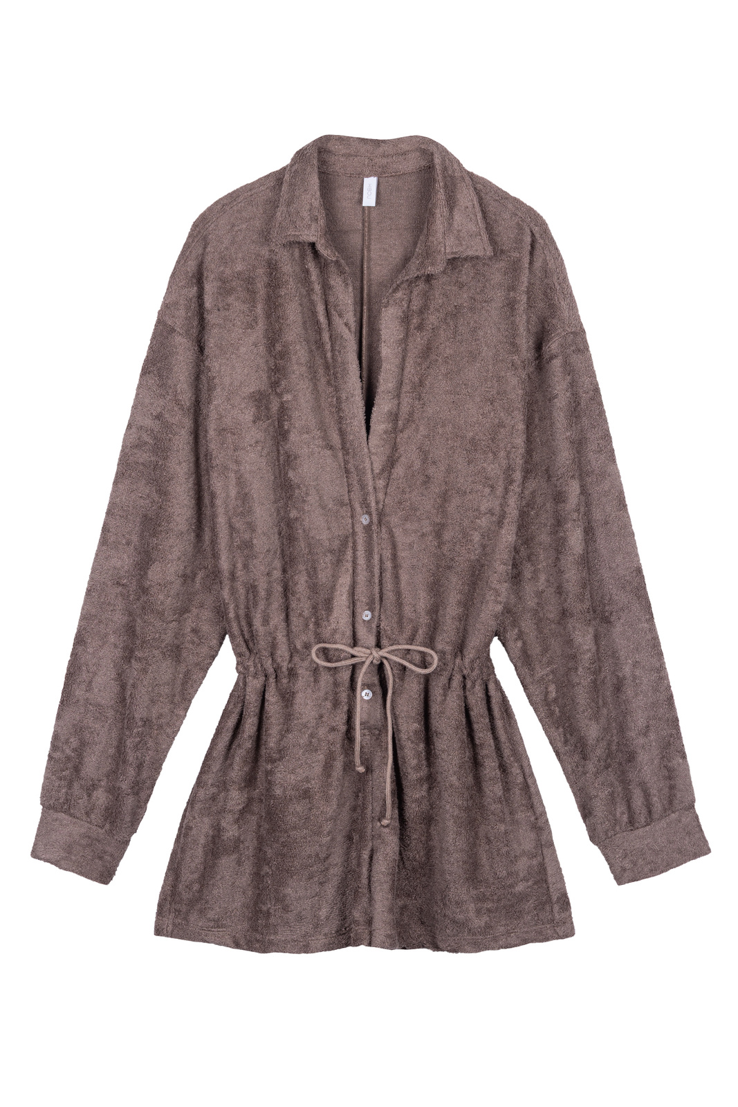Romper with long sleeves and a button-up front, made of terrycloth effect fabric in light brown.