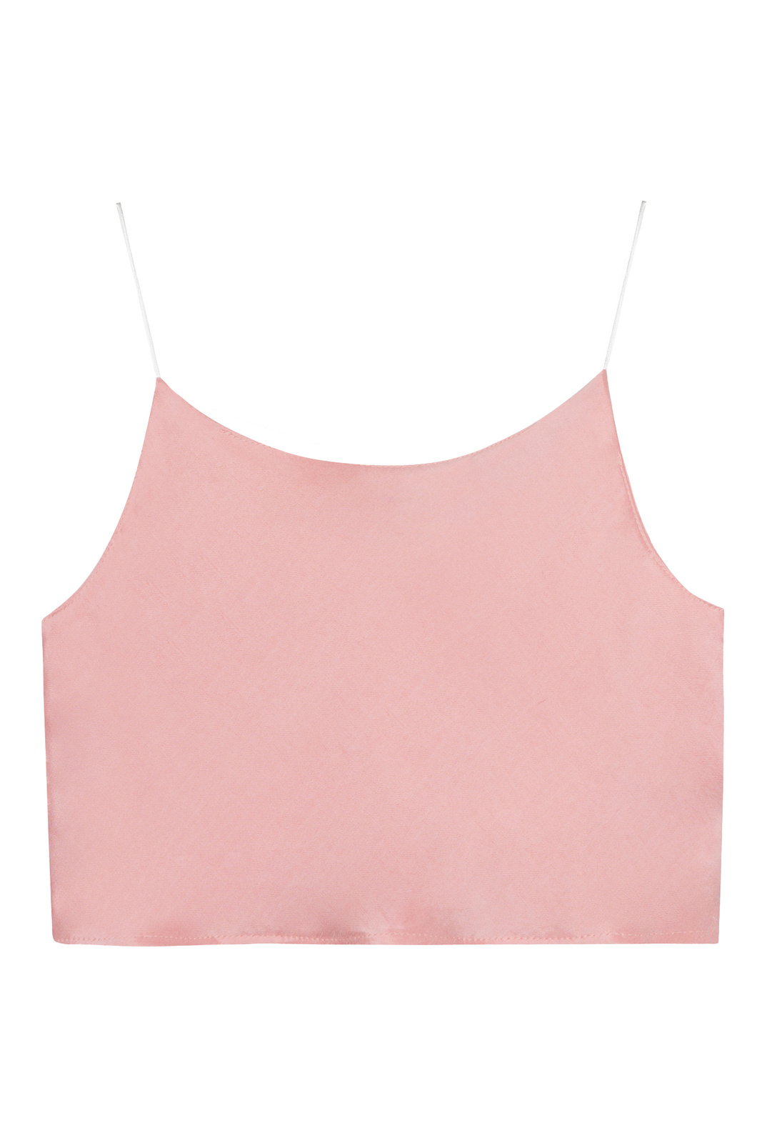 Short, strappy fully lined top, made of silky viscose and lyocell blended fabric with lustrous finish in pink.