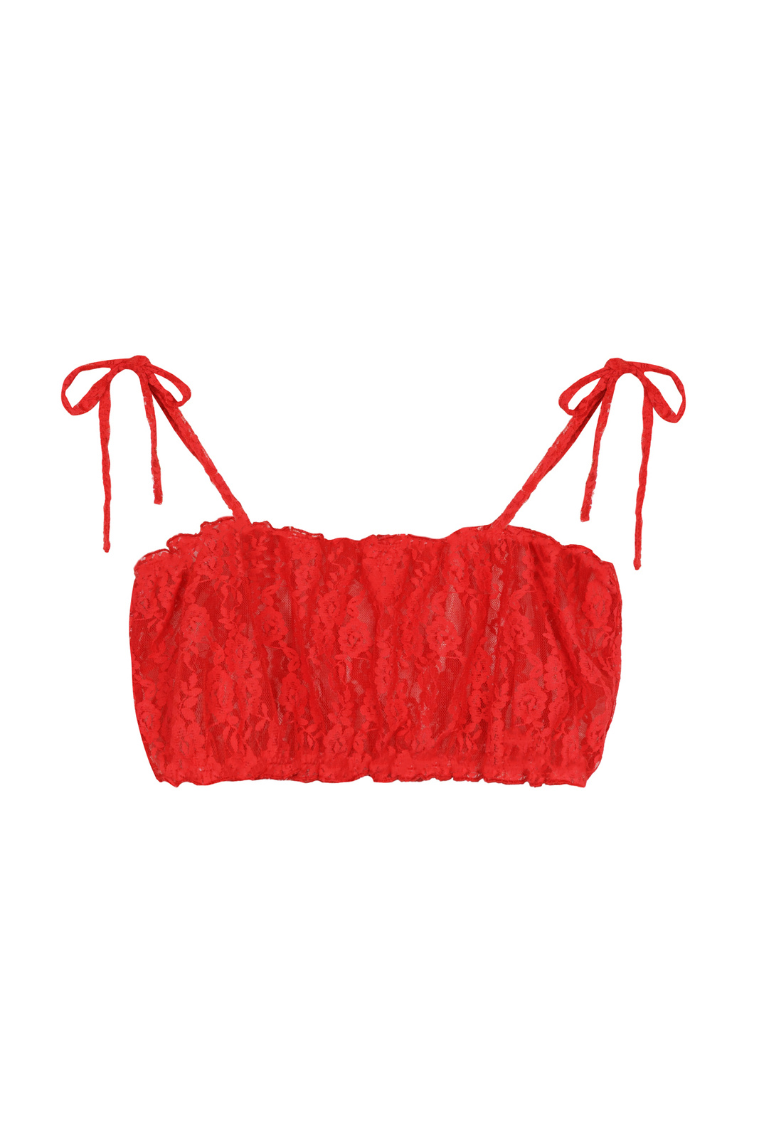Short top with tied straps, made of seethrough, stretchy lace in red.