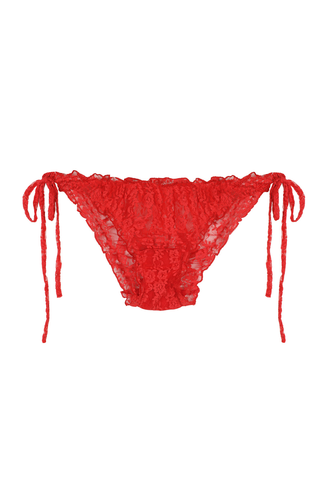 Sheer lingerie panties with side ties, made of seethrough, stretchy lace in red.