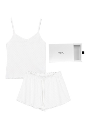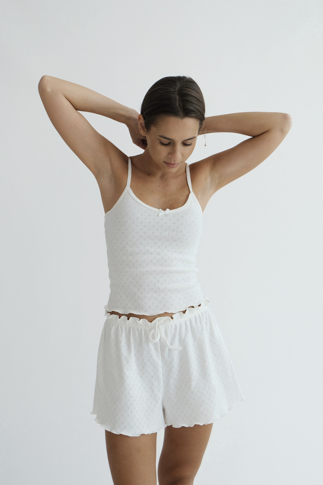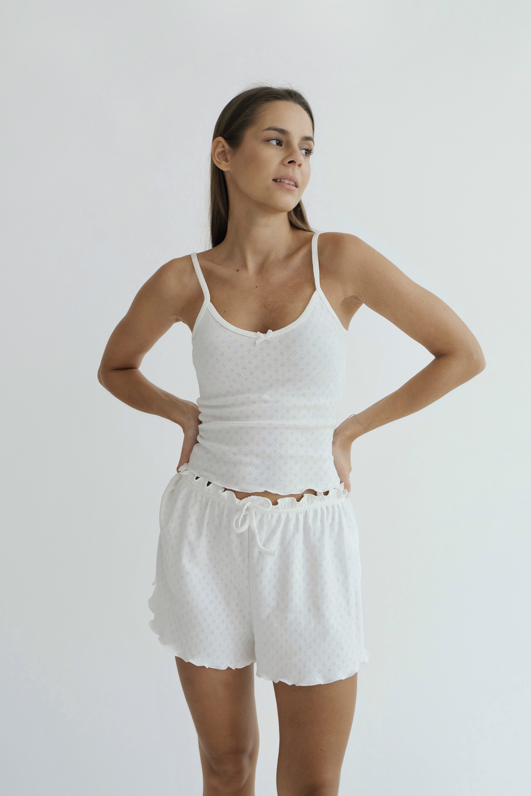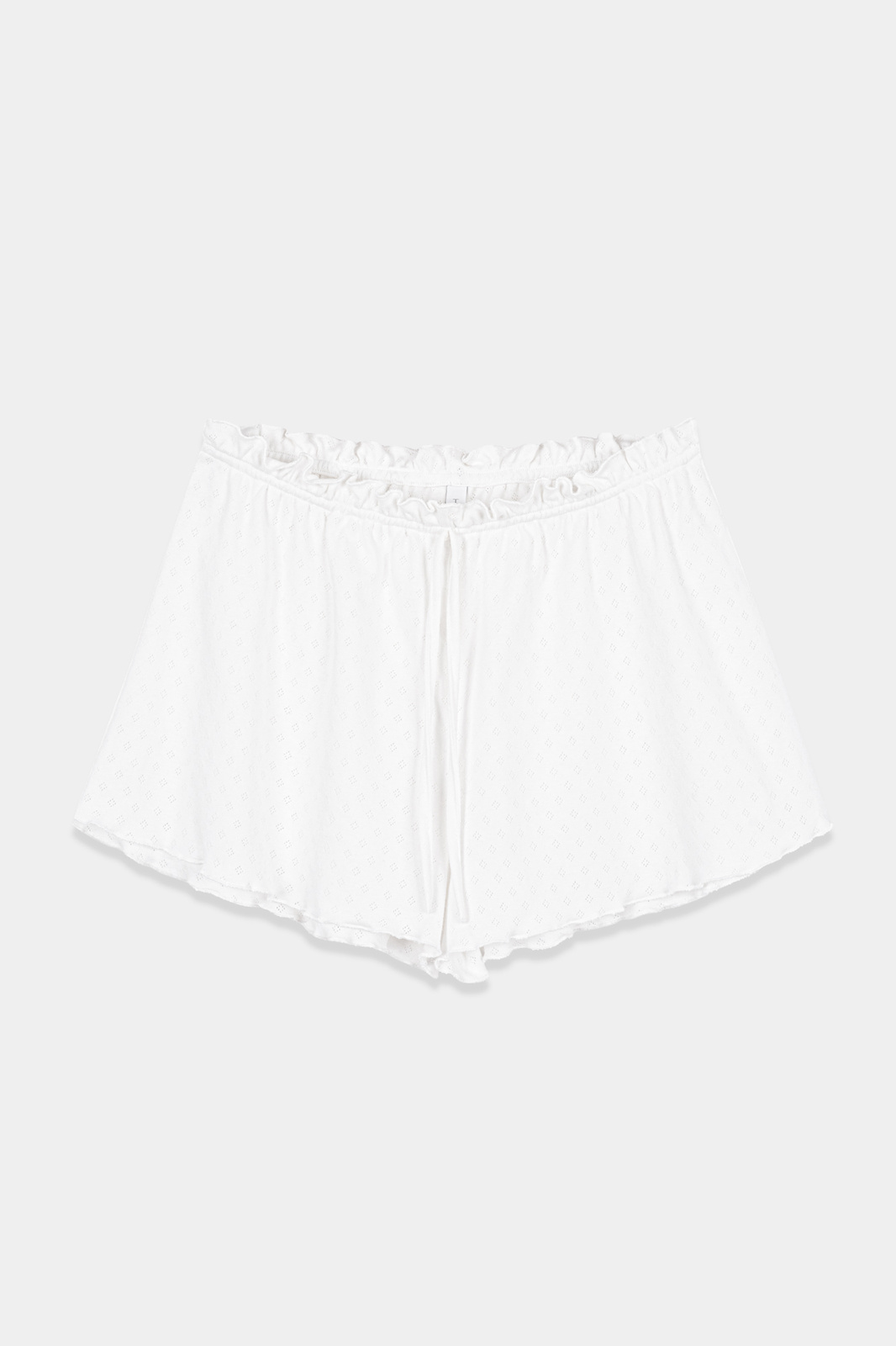 Sleep shorts made of 100% white pointelle cotton fabric with subtle openwork details.