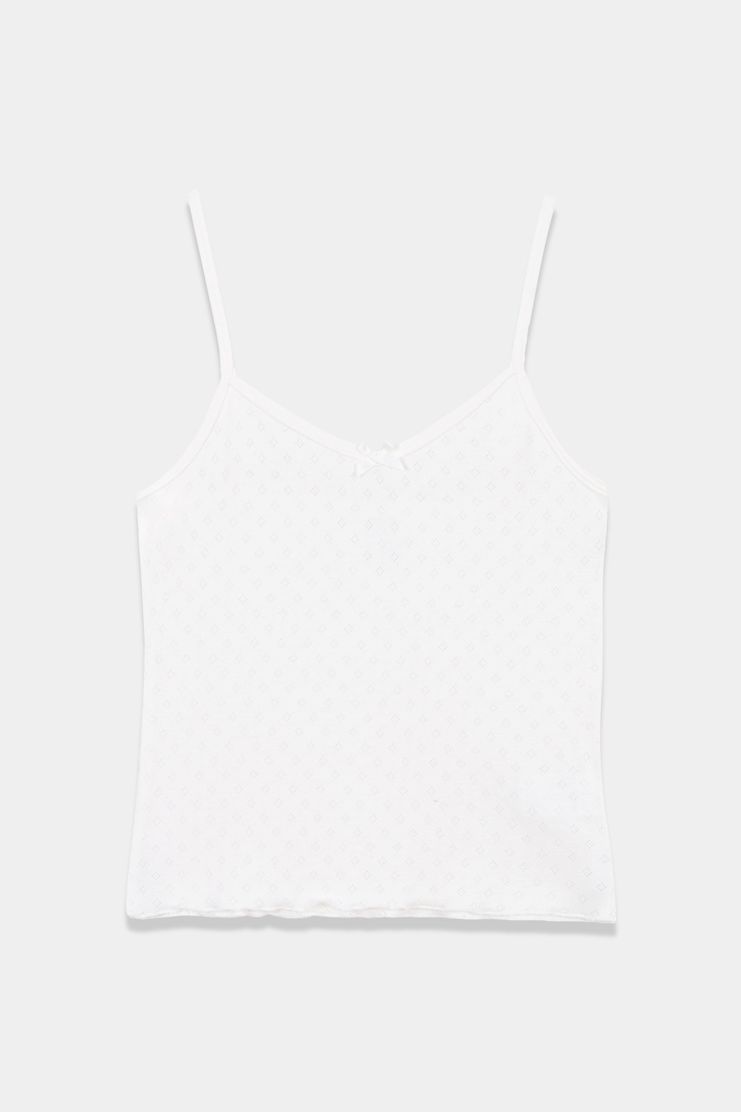 Strappy crop top made of 100% white pointelle cotton fabric with subtle openwork details.