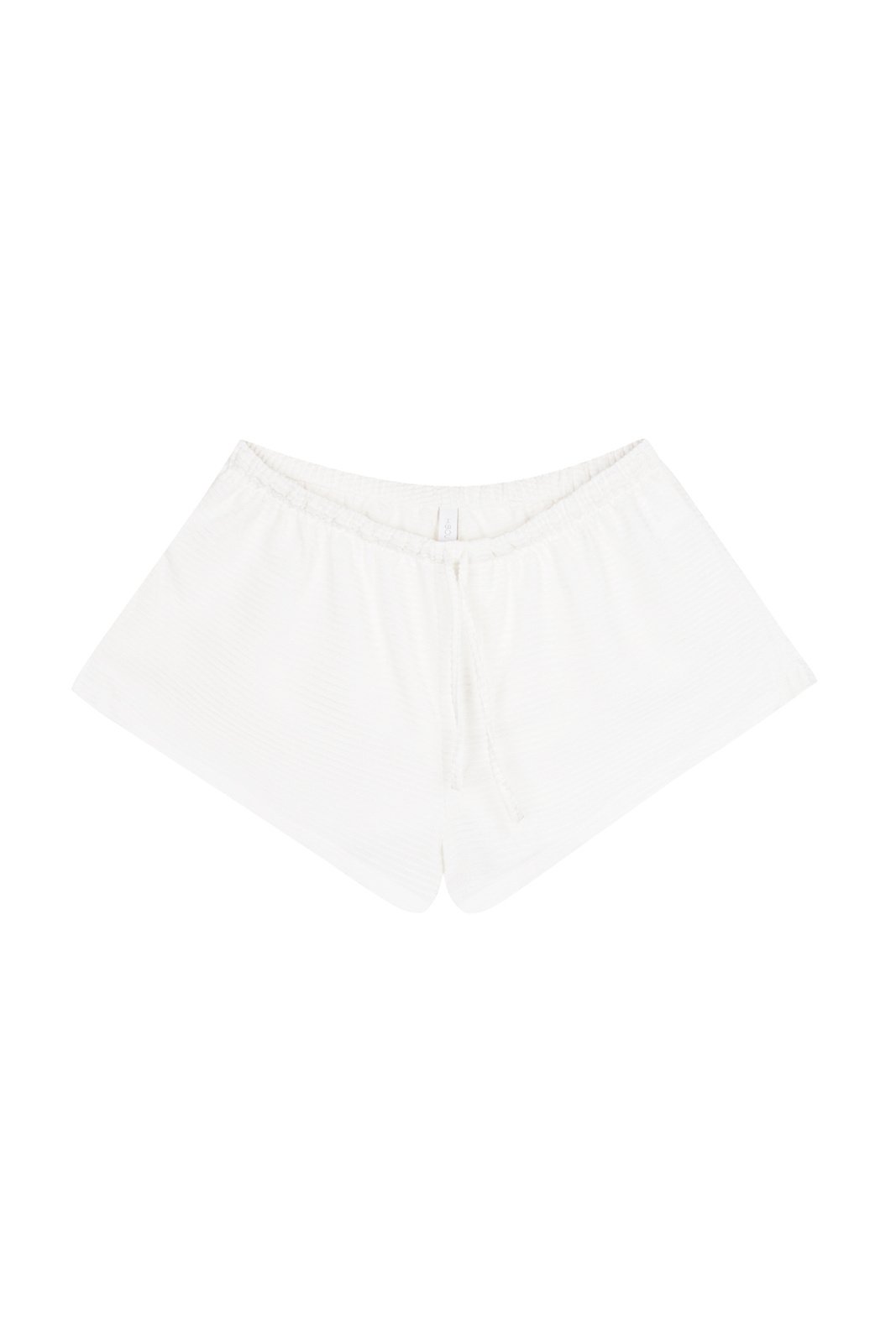 Sleep shorts with elastic waistband, made of lightweight, 100% viscose fabric with alternating sheer and velvety stripes in white.